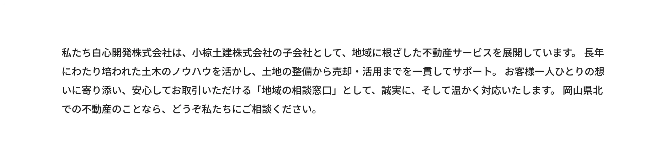 地域密着型の強みを活かし、解体・造成から不動産までを一貫サポート。 地元の皆さまに寄り添い、暮らしと土地の未来を支えます。